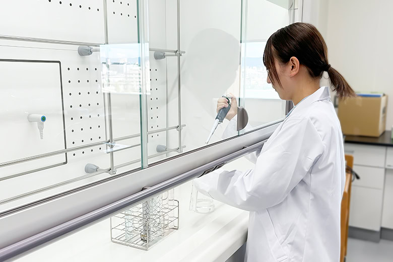 環境衛生研究センターでは、和歌山県の環境保全と県民の保健衛生の向上を推進するための科学・技術的中核機関として環境及び衛生に関する試験検査・調査研究を行っています。私は水質環境に関する業務を担当しており、河川水や地下水、事業所の排水等をサンプリング・分析し、含まれている物質が法令等で定められた基準値を超過していないか確認を行っています。また、温泉成分についての分析も行っており、温泉法に基づく温泉分析書の交付だけでなく、毎年行っている温泉経年変化調査では、県の観光資源の一つである温泉を持続的に利用するため、温泉成分に変化がないかチェックしています。